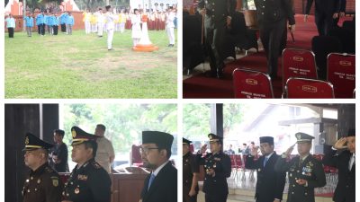 Kapolres Nganjuk AKBP Henri Noveri Santoso, S.H., S.I.K., M.M. bersama jajaran Forkopimda Kabupaten Nganjuk menghadiri upacara peringatan Hari Sumpah Pemuda ke-97 yang digelar di halaman Pendopo Kabupaten Nganjuk, Selasa (28/10/2025).