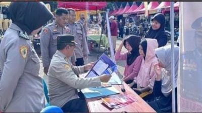 Polres Nganjuk melalui Bagian SDM melaksanakan sosialisasi SPMB SMA Kemala Taruna Bhayangkara, SMA Taruna Bhayangkara Jawa Timur, serta Pendaftaran Bintara Brimob Polri Tahun 2026 di area Car Free Day Alun-alun Nganjuk, Minggu (16/11/2025).